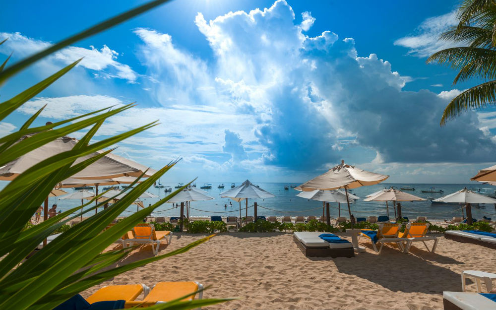 La spiaggia di fine sabbia bianca di Playa del Carmen è attrezzata con ombrelloni, lettini e teli mare a disposizione dei clienti secondo disponibilità.