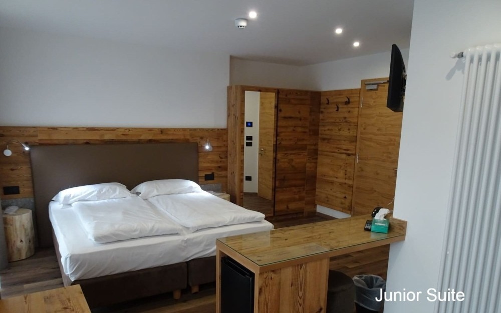 Le camere Junior Suite sono dotate di servizi privati, asciugacapelli, telefono, TV satellitare, cassaforte, minibar (consumazioni a pagamento), collegamento internet Wi-Fi, con balcone vista monte.