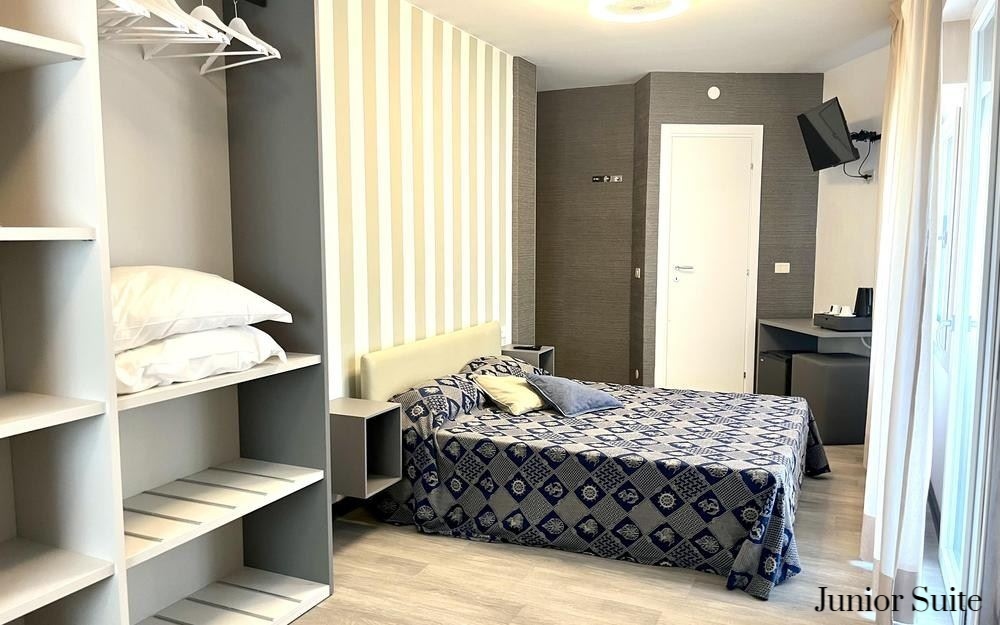 Le Junior Suite (ca. 20 mq.) dispongono di servizi privati, asciugacapelli, letto a castello, terrazzo con tavoli e sedie, aria condizionata, telefono, TV satellitare, cassaforte, mini-frigo, collegamento internet Wi-Fi.