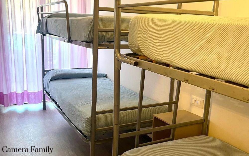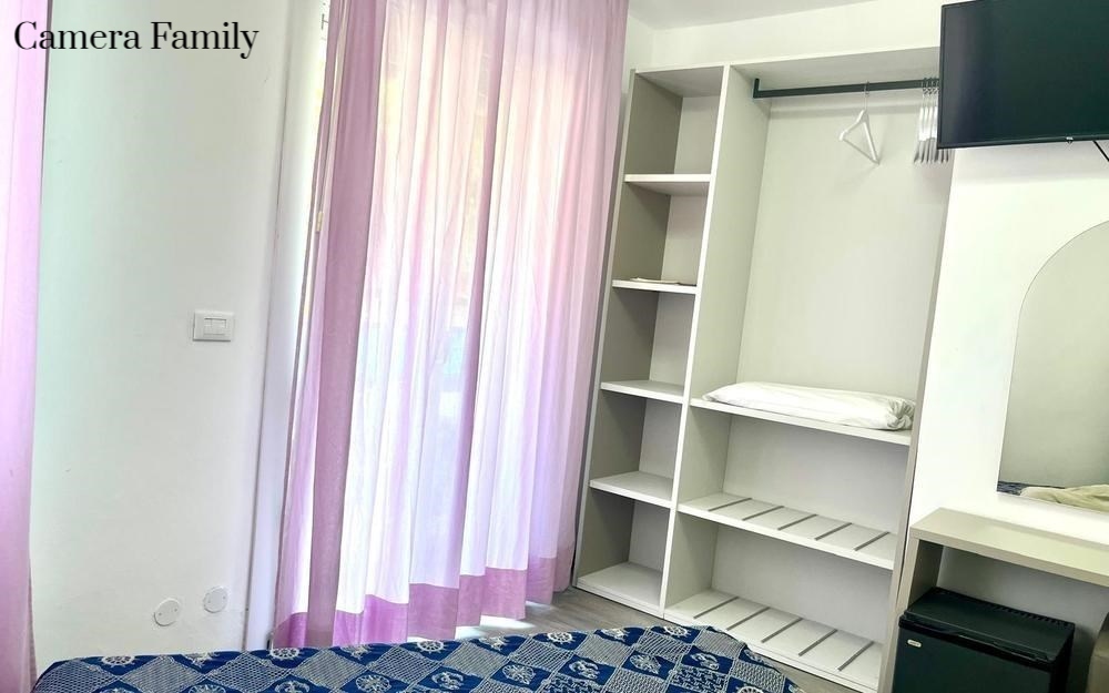Le camere Family (ca. 30 mq.) sono adatte ad ospitare da 4 a 6 persone e dispongono di servizi privati, asciugacapelli, 1 camera da letto matrimoniale 1 camera con 2 letto a castello, terrazzo con tavoli e sedie, aria condizionata, telefono, TV satellitare, cassaforte, mini-frigo, collegamento internet Wi-Fi.