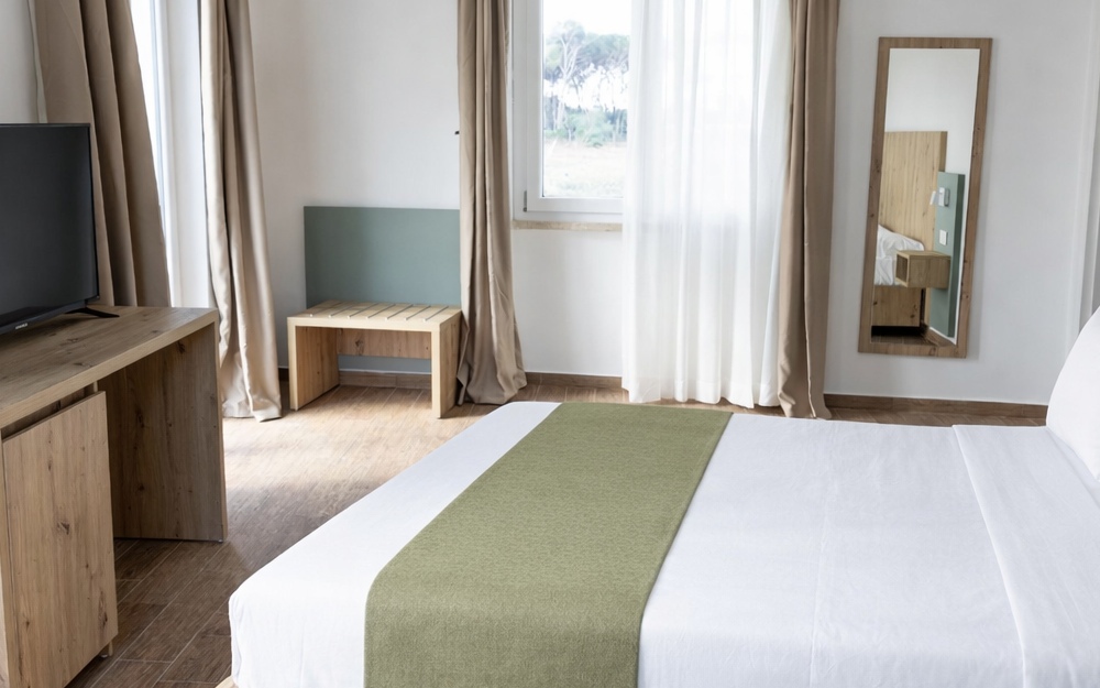 La struttura dispone di 201 camere moderne, rinnovate, dai colori pastello e design funzionale, distribuite su 2 piani. Tutte le camere sono dotate di aria condizionata, wi-fi, TV lcd, asciugacapelli, cassaforte, mini frigo, telefono, doccia e set di cortesia. Si suddividono in: Camere Standard con balcone o patio (1/4 persone), ubicate nel corpo centrale o nei blocchi limitrofi e sono tutte dotate di balcone o patio;Camere Cottage con patio (2/3 persone) indipendenti immerse nel verde con patio esterno; Famiy Cottage con patio su richiesta con relativo supplemento (4 persone), dispongono di 2 camere da letto separate con porta, immerse nel verde e con patio esterno. Alcune camere quadruple possono avere letto a castello per i bambini. Disponibili camere per disabili (4 unità situate a piano terra, sempre su richiesta).