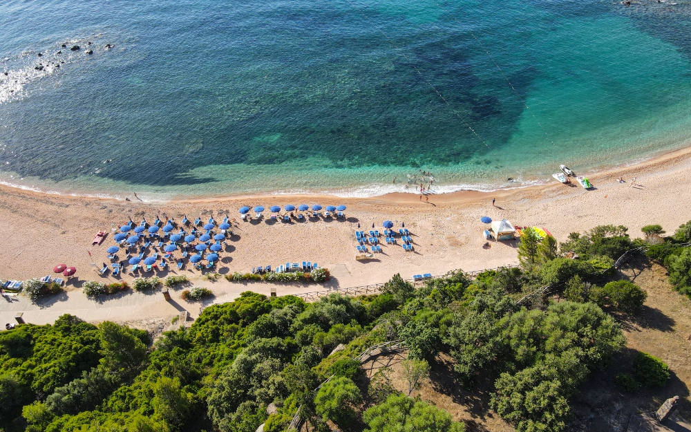 Il Resort dista circa 200 metri dalla caratteristica spiaggia, rosa per la presenza di piccoli sassolini colorati, attrezzata con ampia disponibilità di ombrelloni, lettini e sdraio ad esaurimento. Si raggiunge tramite una scalinata che dal resort scende al mare.