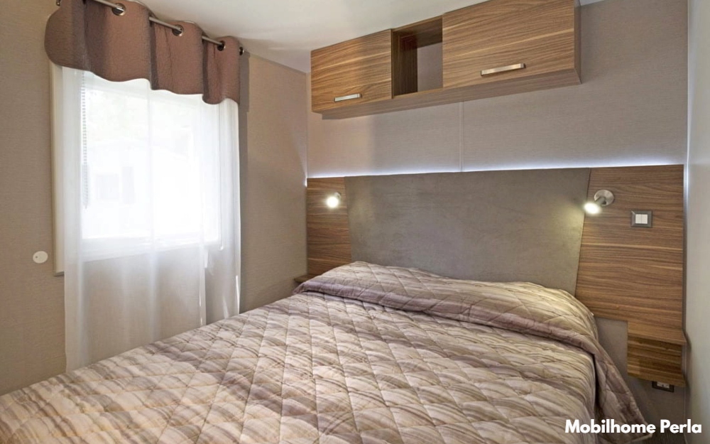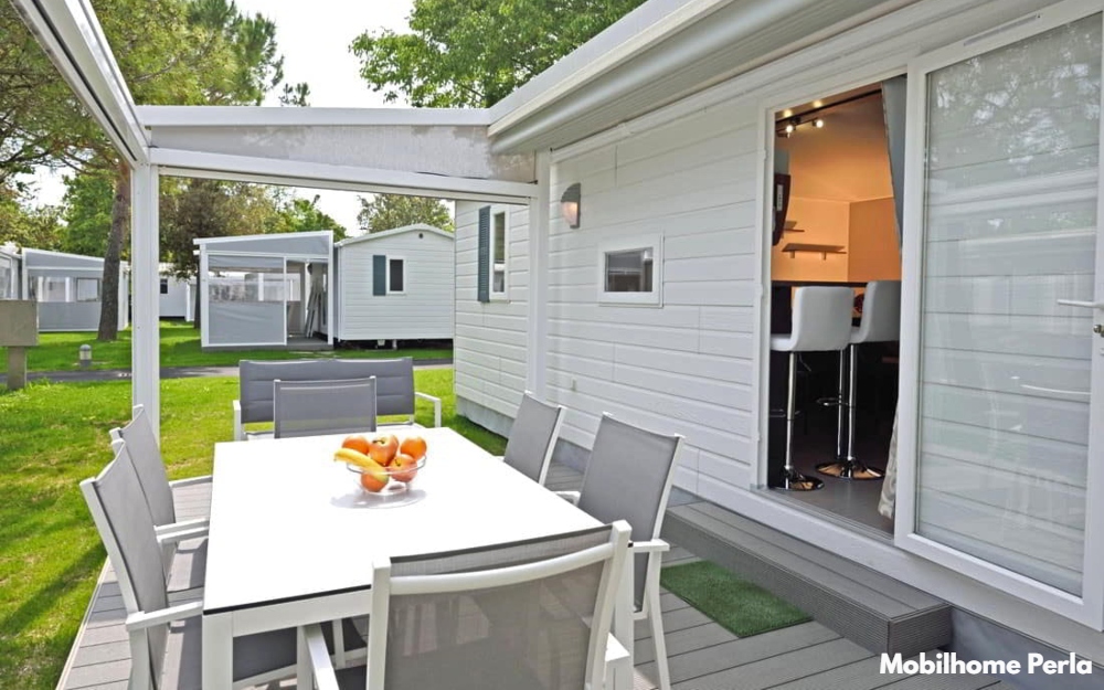 La Mobilhome Perla (di ca. 31 mq), casa mobile con occupazione massima di 7 persone (max. 6 adulti + 1 bambino), dispone di servizi privati, aria condizionata, angolo cottura attrezzata con stoviglie, frigorifero, microonde, lavastoviglie e bollitore per l'acqua, camera matrimoniale, camera con un letto a castello e un letto singolo, soggiorno con divano letto, cassaforte e terrazzo completa di tavolo, sedie e divanetto.