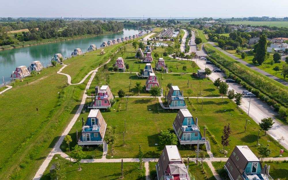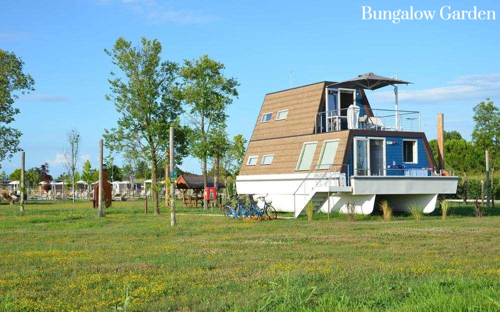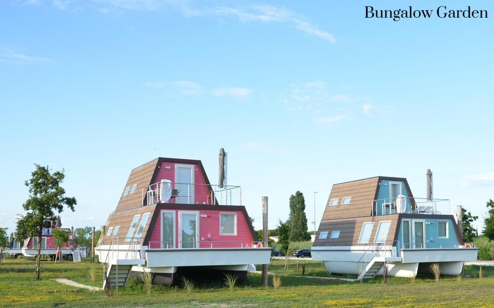 I Bungalow Garden sono adagiati all’interno del resort in un’ampia area verde, le Houseboat Lagoon sono ormeggiate lungo una darsena interna e le Houseboat River sono ormeggiate in modo sicuro lungo la sponda del fiume Tagliamento con accesso tramite banchine in legno.