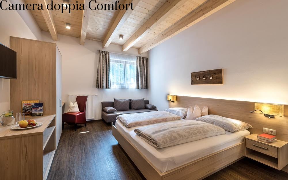 Le camere Comfort (20-23mq ca.) dispongono di servizi privati, asciugacapelli, Smart TV, collegamento internet Wi-Fi e pavimento in legno.
