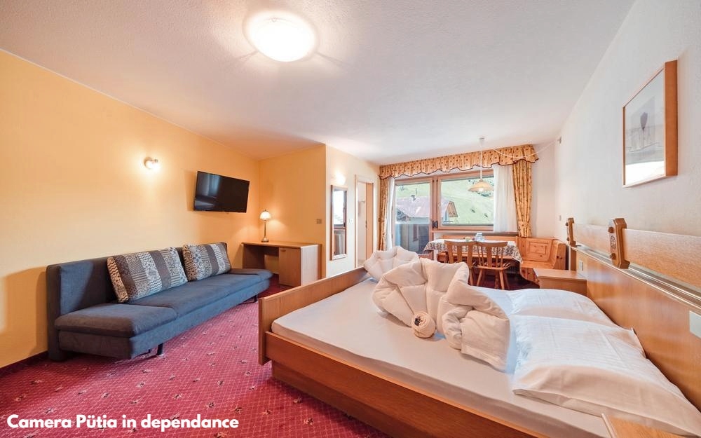 Le camere Pütia (di ca. 25 mq), locate nella dependance, dispongono di servizi privati, asciugacapelli, TV satellitare, collegamento internet Wi-Fi, cassaforte e balcone.