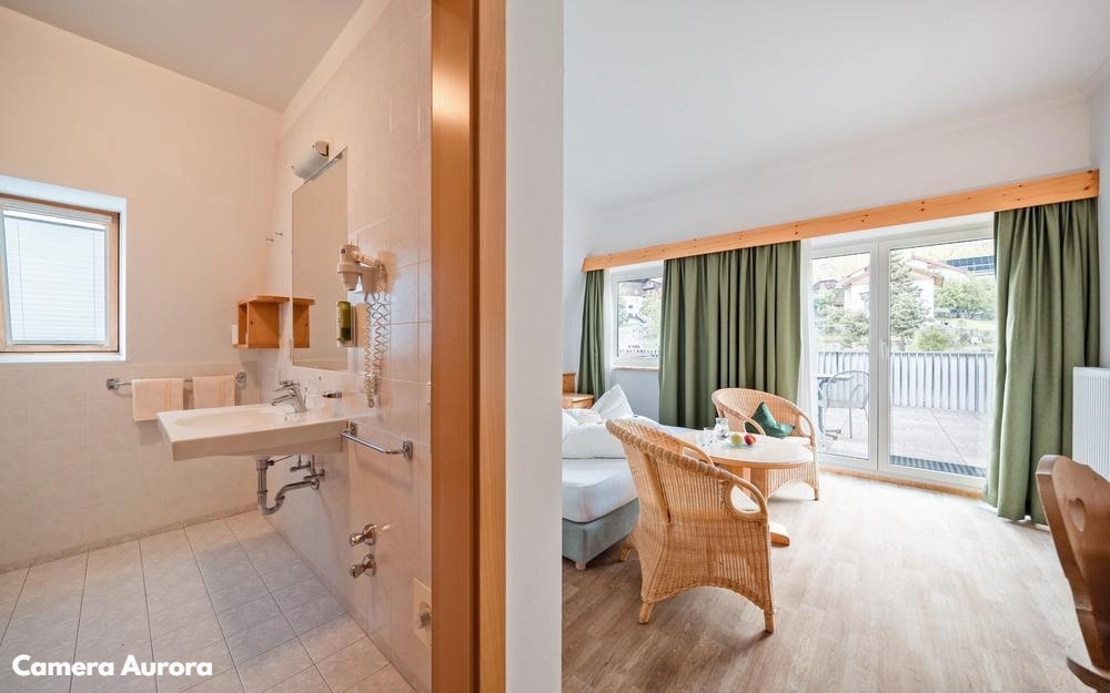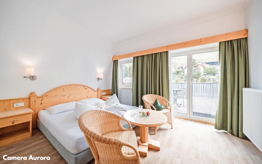 Le camere Aurora (di ca. 25 mq), arredate in stile alpino, dispongo di servizi privati, asciugacapelli, TV satellitare, collegamento internet Wi-Fi, cassaforte e balcone.