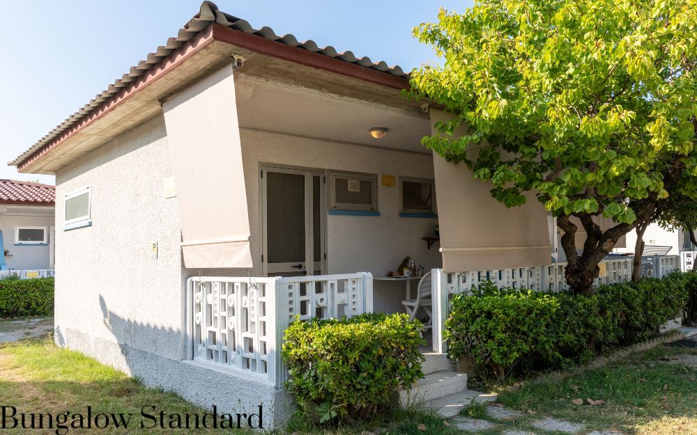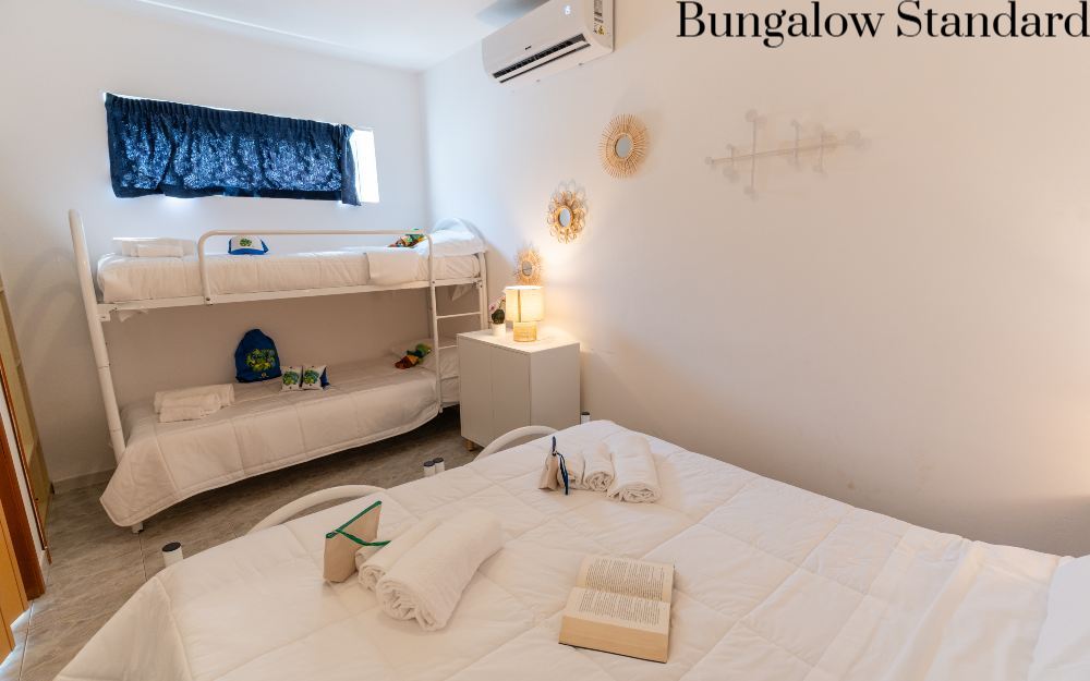 Le sistemazioni Bungalow Standard (ca. 27mq) dispongono di servizi privati, terrazzo, angolo cottura, 1 camera da letto separata, aria condizionata, TV, frigo, letto a castello, tavoli e sedie in esterno e stoviglie.