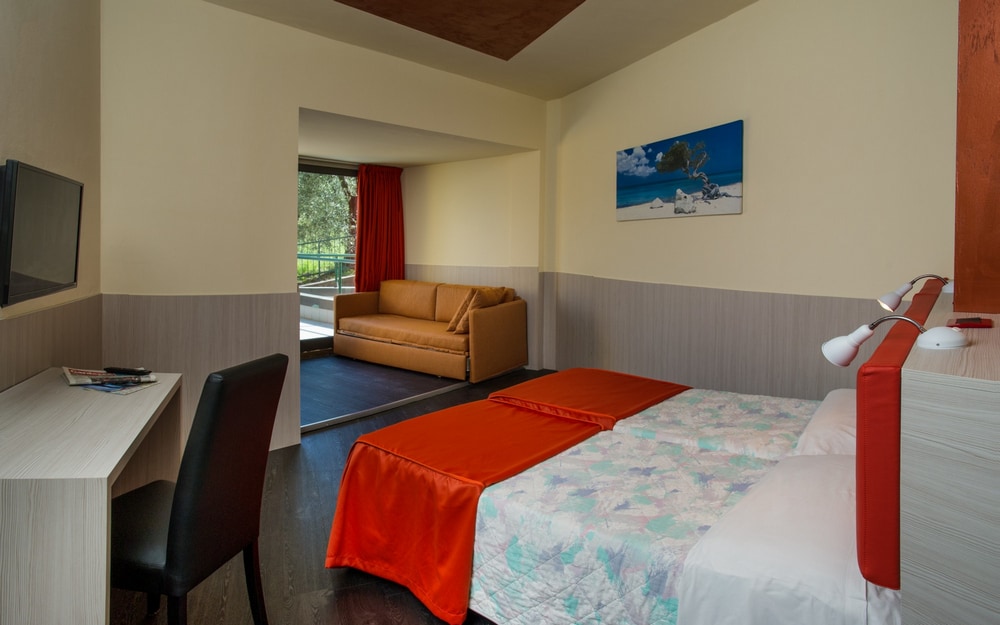 Le camere Family sono dotate di servizi privati, asciugacapelli, TV satellitare, aria condizionata, telefono, balcone e vista lago laterale.