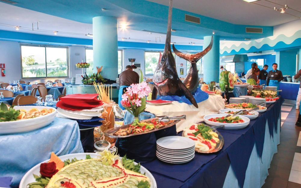 - Pensione completa con prima colazione a buffet, pranzo e cena con piatti regionali e internazionali; (buffet o servizio al tavolo a discrezione della Direzione):